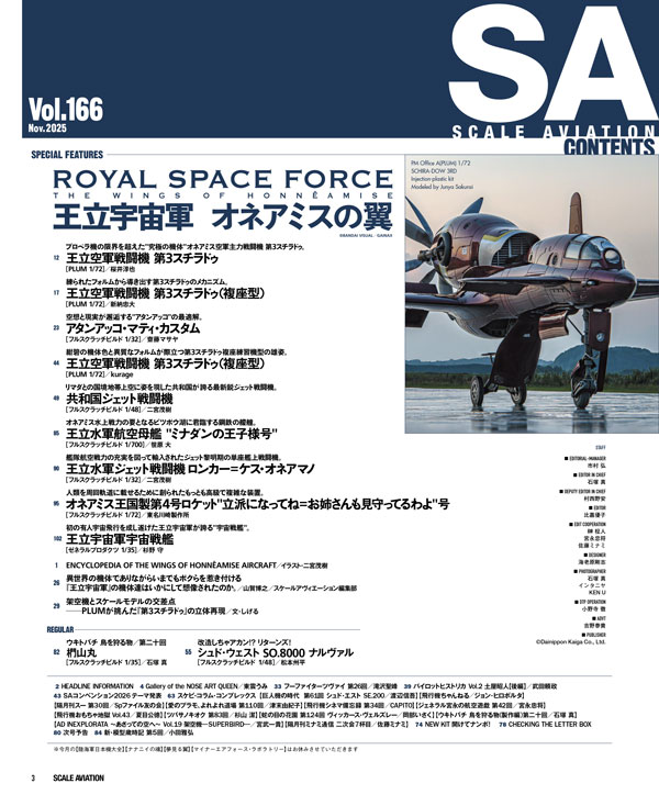 『隔月刊スケールアヴィエーション』2025年11月号では、この伝説的作品に登場する機体をクローズアップ! 世界観に根ざした独特の形状と存在感を放つ機体たちを、模型的アプローチで立体化します。唯一のキット化を果たした王立空軍戦闘機 第3スチラドゥ(1/72 PLUM)はもちろん、共和国ジェット戦闘機(1/48 フルスクラッチビルド)や王立水軍ジェット戦闘機 ロンカー=ケス・オネアマノ(1/32 フルスクラッチビルド)、本作のクライマックスを鮮やかに飾ったオネアミス王国製第4号ロケット(1/72 フルスクラッチビルド)など、誌面では市販キットが存在しない機体までフルスクラッチビルドによる製作を敢行し、その魅力を余すところなく再現。『王立宇宙軍』を観たことがある方には立体ならではの発見を、未見の方には作品世界へ踏み込むきっかけを与えてくれる、そんな一冊に仕上がりました。「GALLERY OF THE NOSE ART QUEEN」には東雲うみさんが登場! 3回目の登場となる今回は、与圧服とゴールドバニーの豪華2本立てで巻頭を飾ります!